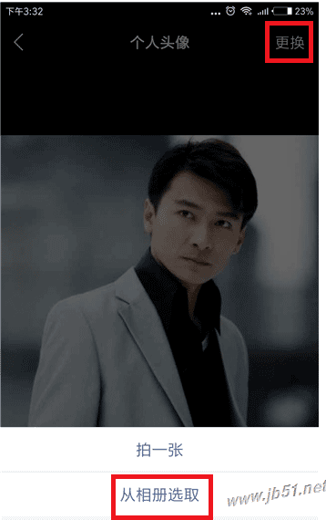 进入新的界面,点击【更换】选项,然后点击【从相册中选取】。