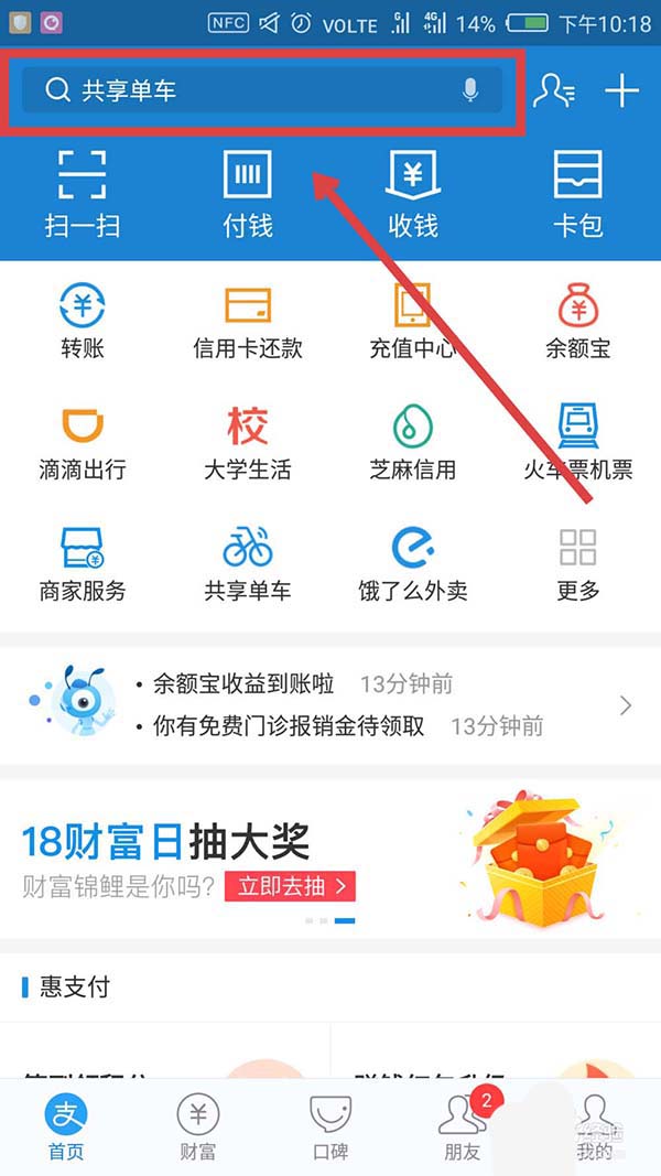 1、首先我们打开支付宝,点击界面最上方的搜索框,如图所示。