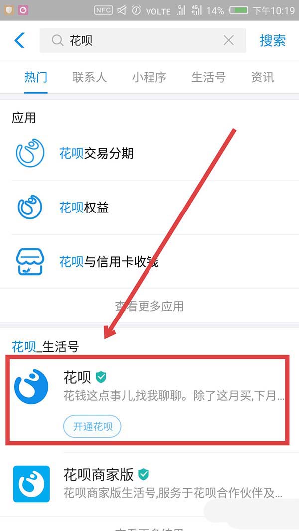 2、然后在搜索框里输入【花呗】并搜索,然后在下面找到生活号【花呗】,点击进入。(需注意这里的花呗后面是由认证的,即一个小对勾,如图所示。)