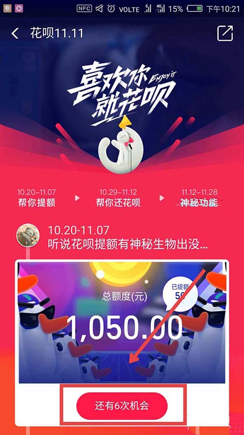 5、这样我们就进入到【花呗11.11】的界面中了,下面有一个【帮你提额】,点击进入。每个人拥有10次提额机会,像我已经提了4次额度了,还剩下6次机会。
