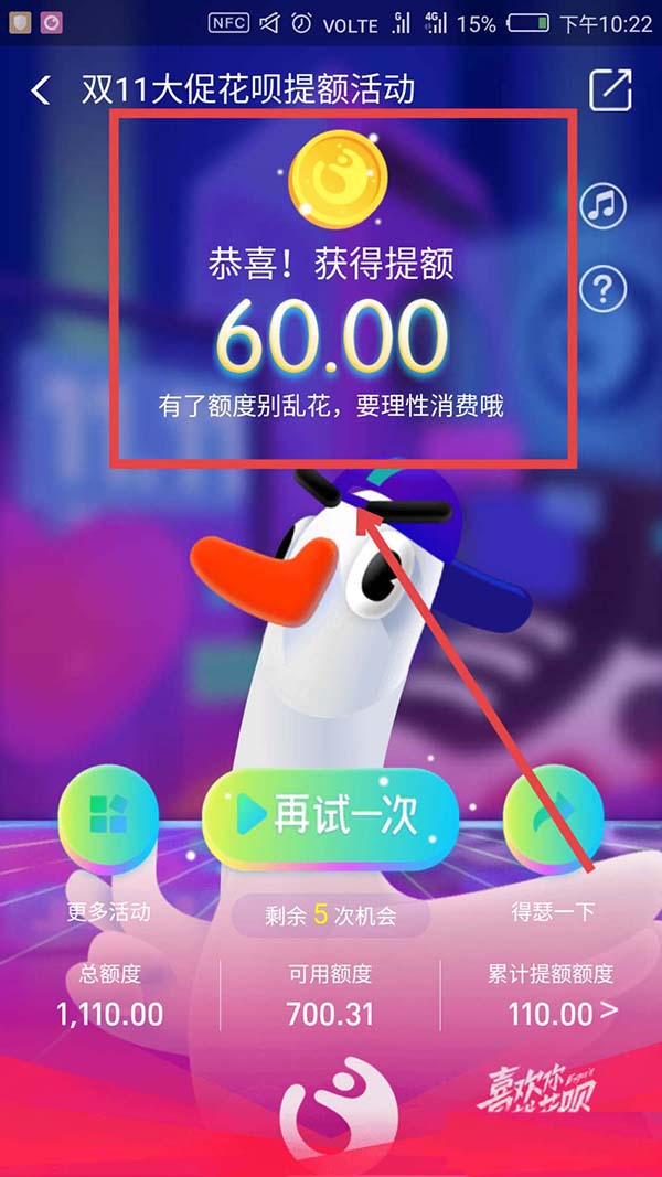 7、挑战成功后我们就能获得花呗提额了,如图所示,我这次获得了60元的提额,不过如果挑战不成功的话,是不能获得花呗提额的。