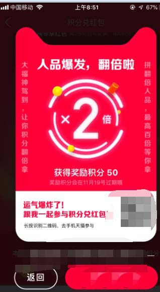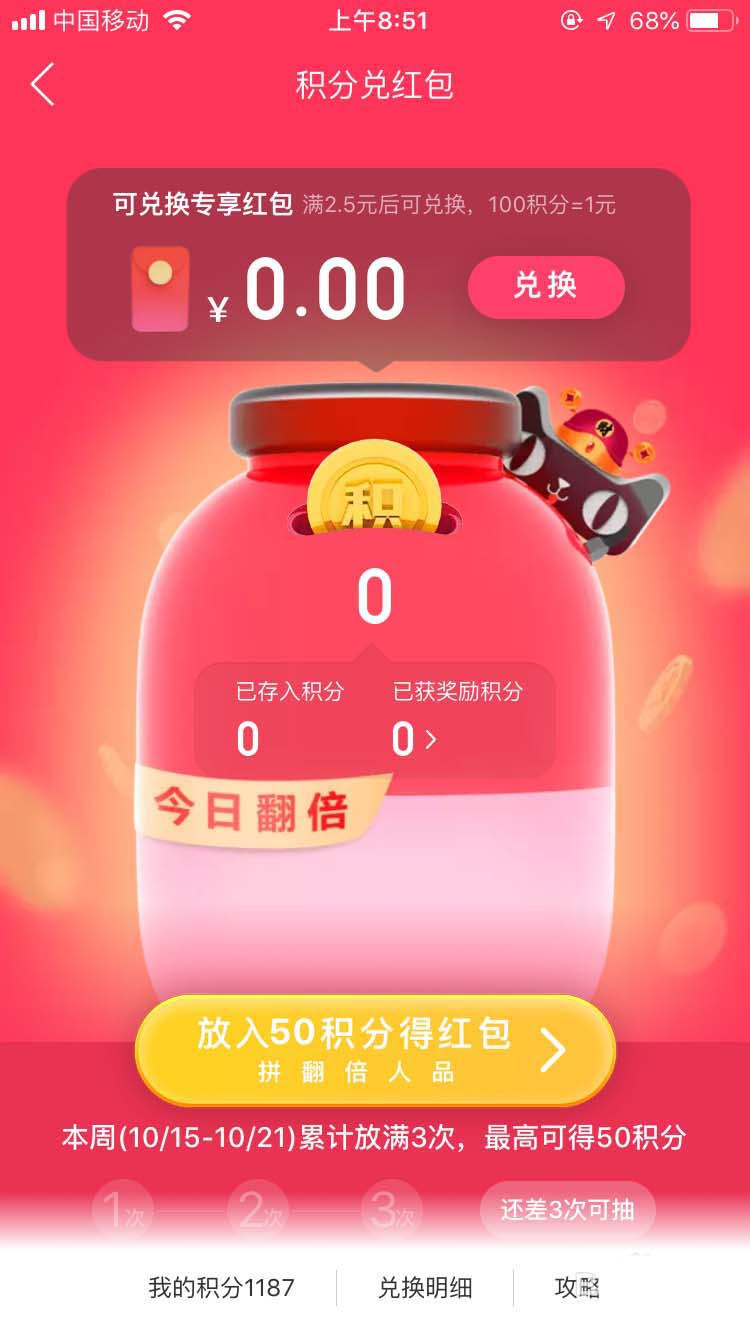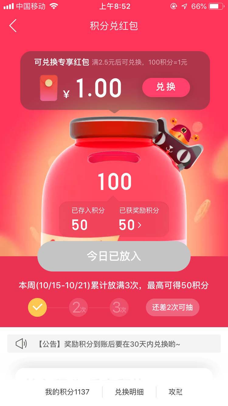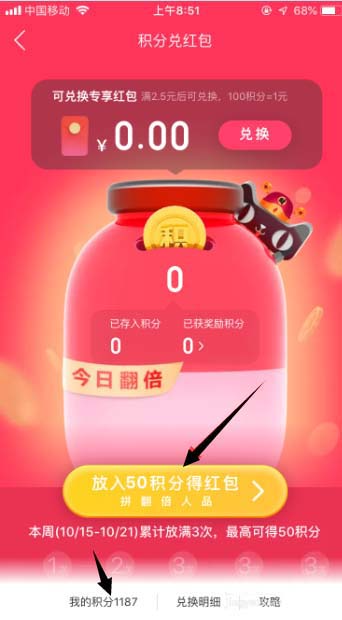 5、点下放入50积分得红包,然后正好是10月20日,积分翻倍的日子。就翻了1倍变成100积分。
