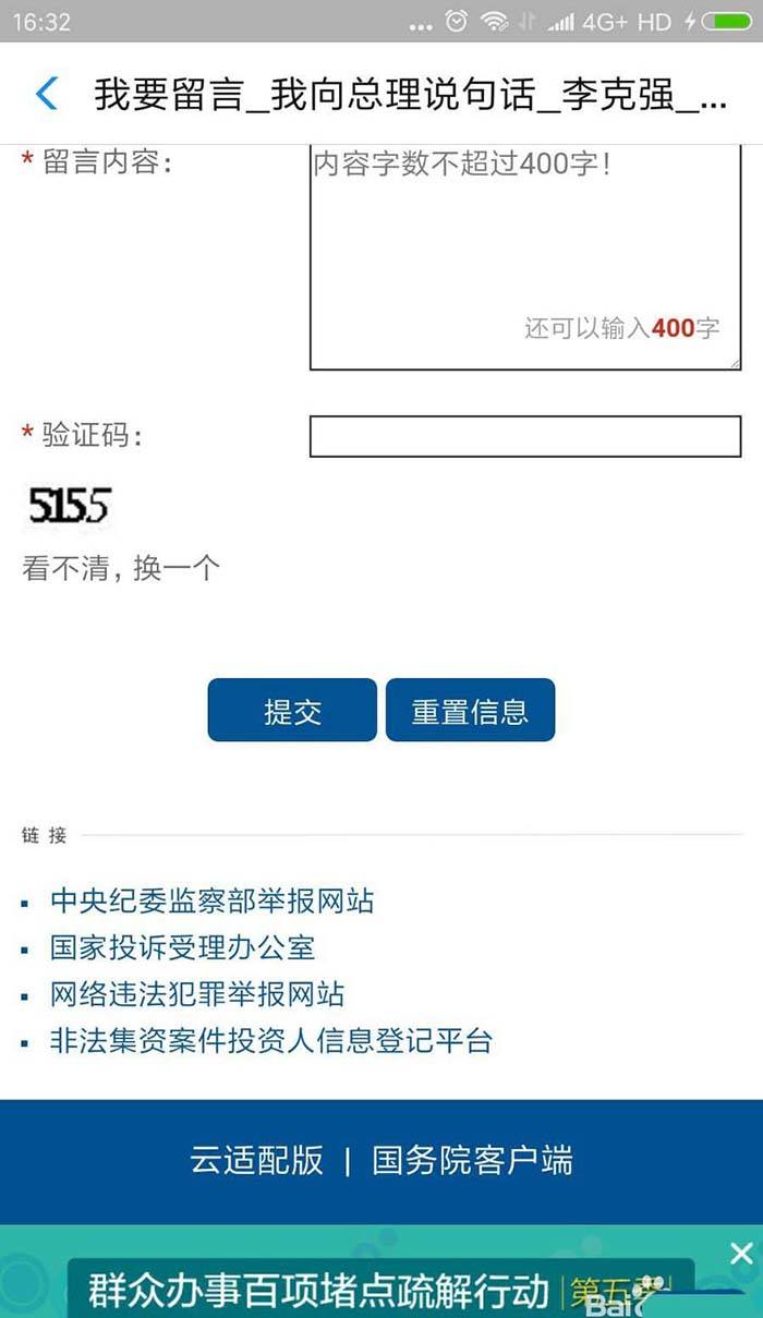 6、留言内容每次只能填写400字,所以要简明扼要哦。填好后我们点击提交就可以提交留言信息了。