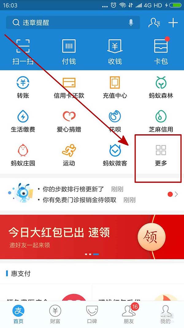 1、我们进入支付宝后,在主界面可以看到支付宝的各种应用,如果没有城市应用的话,我们点击“更多”。