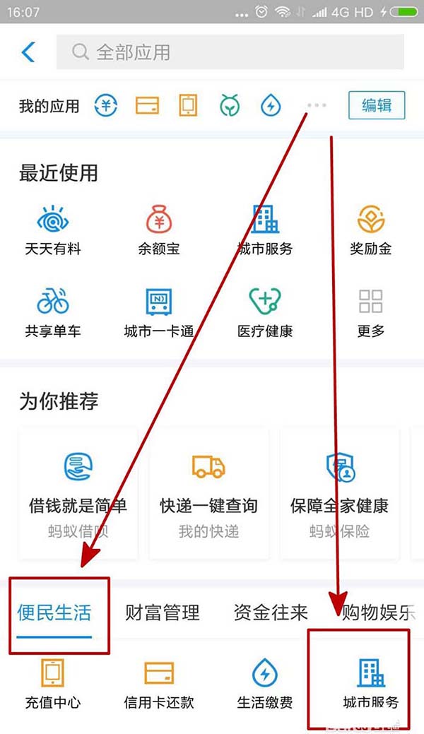 2、这样就会进入应用列表界面,我们在便民生活栏目下面可以看到“城市服务”,我们点击进入。