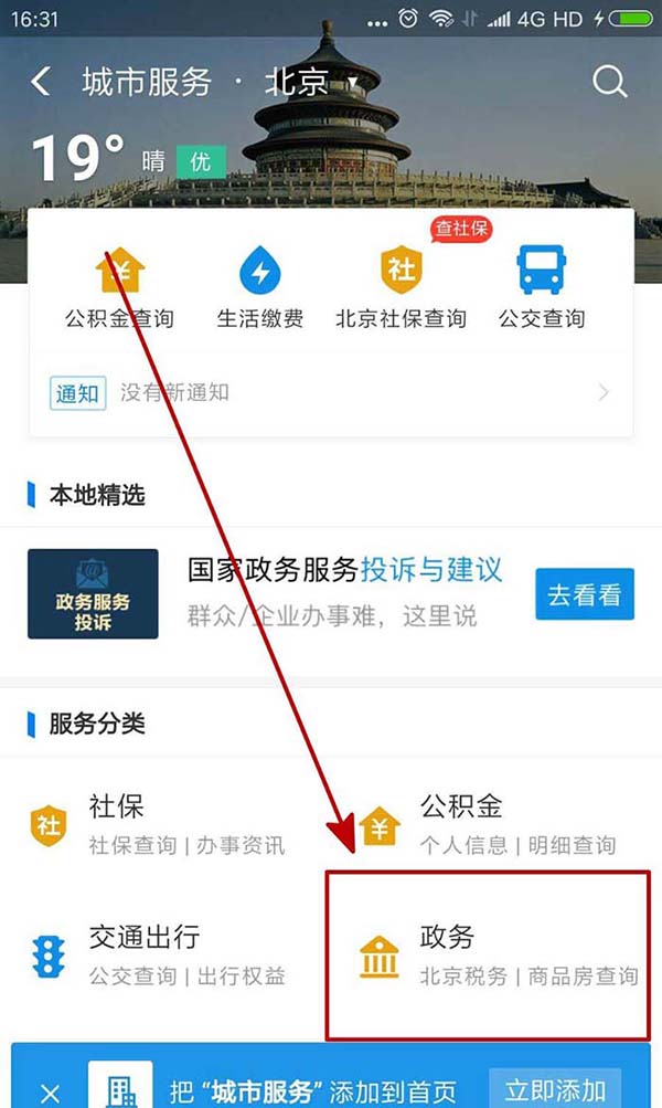 3、在城市服务下我们可以进行一些本地的服务,我们选择服务分类里的“政务”。