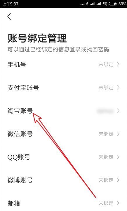 6、在打开的账号绑定管理页面中,可以看到“淘宝账号”的菜单项