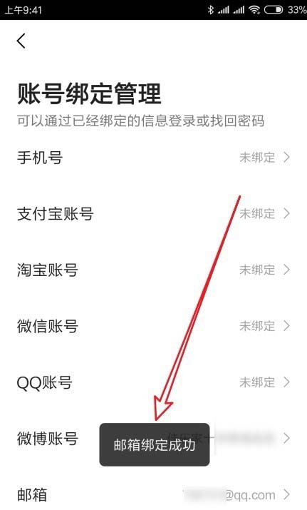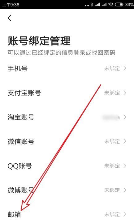 4、这时会打开账号绑定管理页面,可以看到“邮箱”的菜单项。