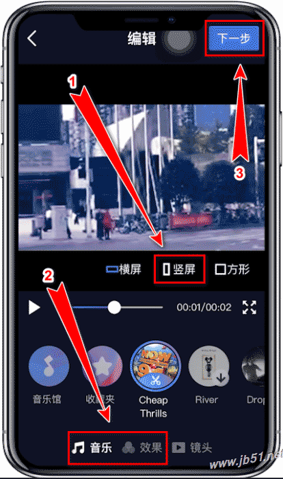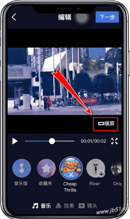 6、弹出横向拉条后,点击【竖屏】即可将横向视频切换为竖屏。同时,如果要修改视频音乐或特效,可以点击底部的【音乐】、【效果】标签。设置好后点击右上角的【下一步】;