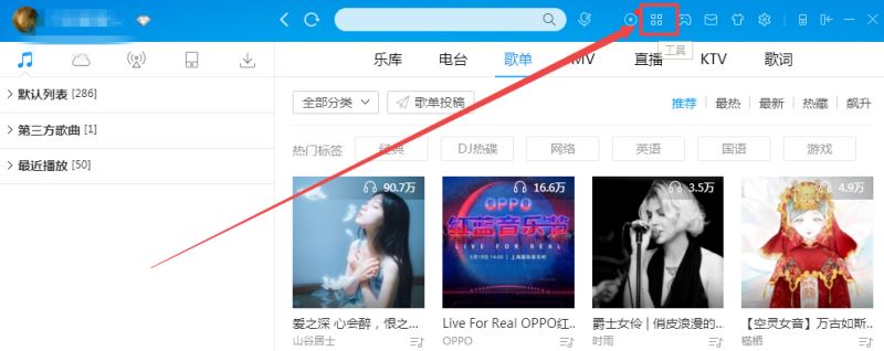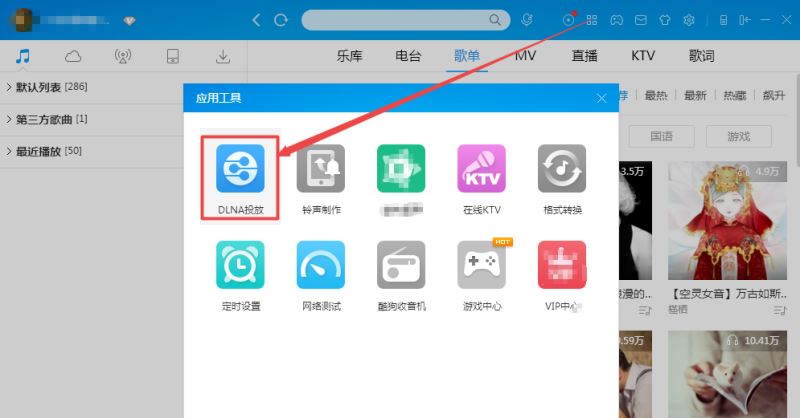 2、登录酷狗音乐电脑端,进入页面,点击“工具”图标,在弹出的页面中点击“DLNA投放” 选项,