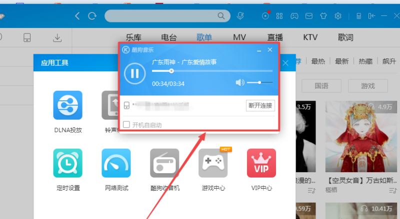 6、现在开始,酷狗音乐电脑端就可以播放手机酷狗中的歌曲了,不想连接了,可以点击断开连接。