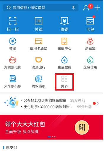 打开手机支付宝,进入首页,点击【更多】选项,