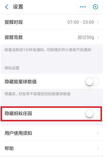 进入蚂蚁森林设置界面,点击【隐藏蚂蚁庄园】选项,将其打开,