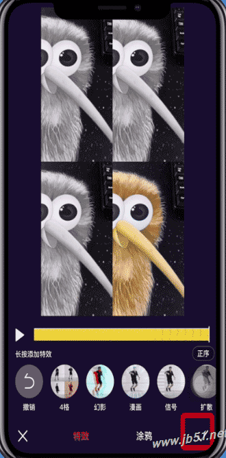5、选择“4格”特效并长按,就能预览视频效果了,