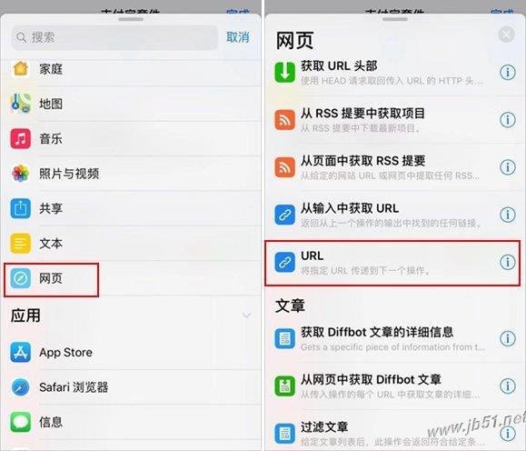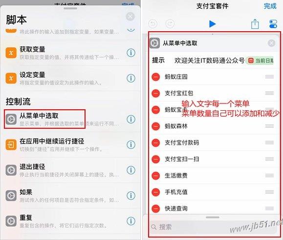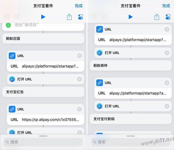 那就是我们添加这些菜单之后,我们实现点击某一个之后就打开,这里就非常简单。如果看过IT数码通小编之前制作的捷径教程,相信这点很容易想到,那就是添加 URL组件和打开URL组件,这两个2组件均可以在网页里面找到,添加URl组件之后,我们就需要输入支付宝套件每一个对应的URL路径,如下图所示。
