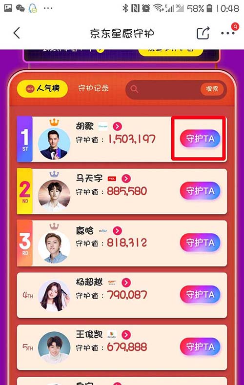 4、如果我们要将参与的话,滑动屏幕,找到相关明星,在后方点击【守护】即可