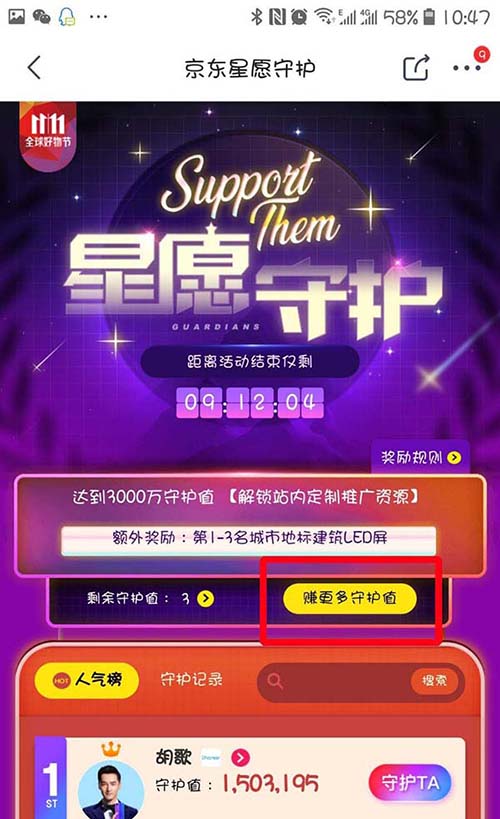 6、每人每天都有3次免费机会参与,如果想要更多的守护值参与,我们可以点击【赚更多守护值】,接着就会弹出每日任务,按照上面要求即可获得守护值。
