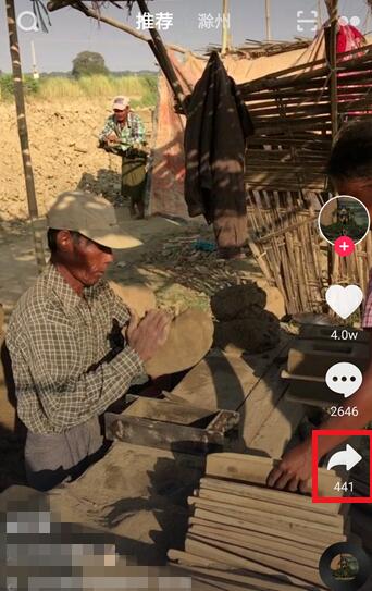 打开抖音App,进入视频播放界面,点击右侧的【转发】,
