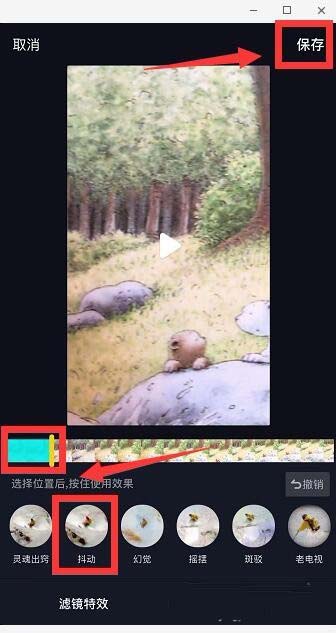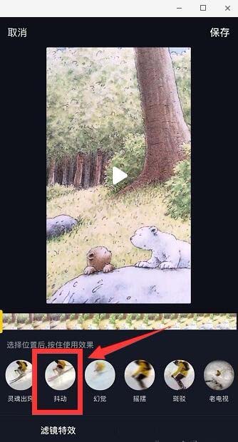 6、长按“抖动”,视频进度条有部分会变成蓝色,这部分就是使用了抖动特效的,松开鼠标就停止使用特效,点击“保存”。