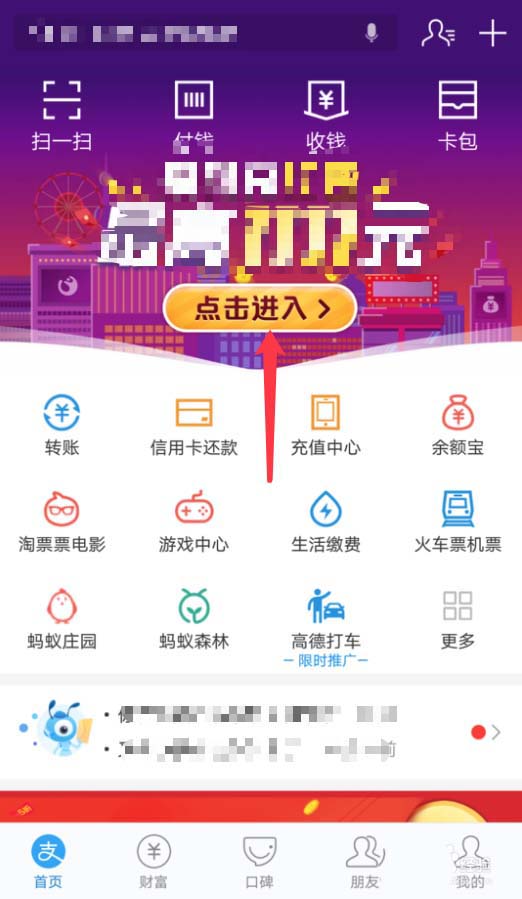 1、打开支付宝首界面,在顶部的活动banner中,点击进入相关活动
