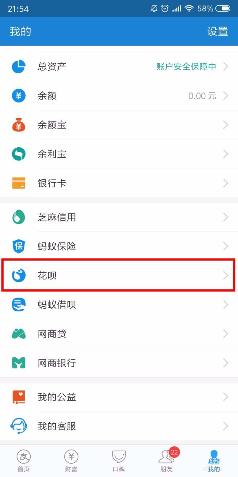 1、启动支付宝在【我的】页面,点击【花呗】进入
