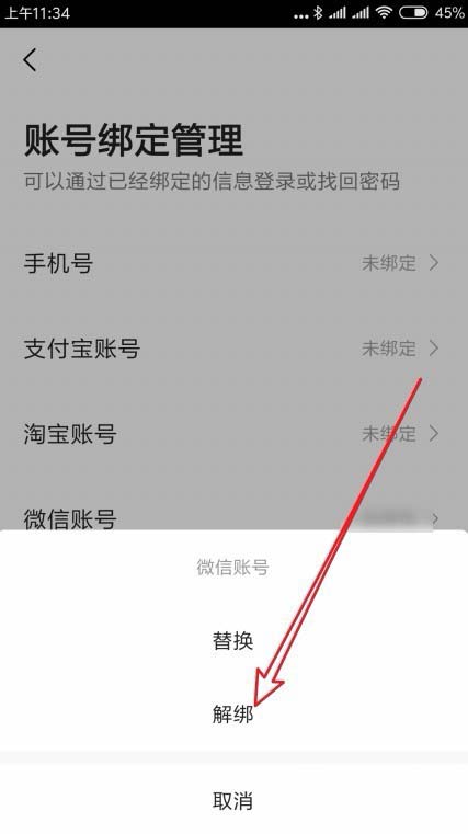 7、点击后会弹出一个微信账号的管理菜单,点击“解绑”的菜单项。