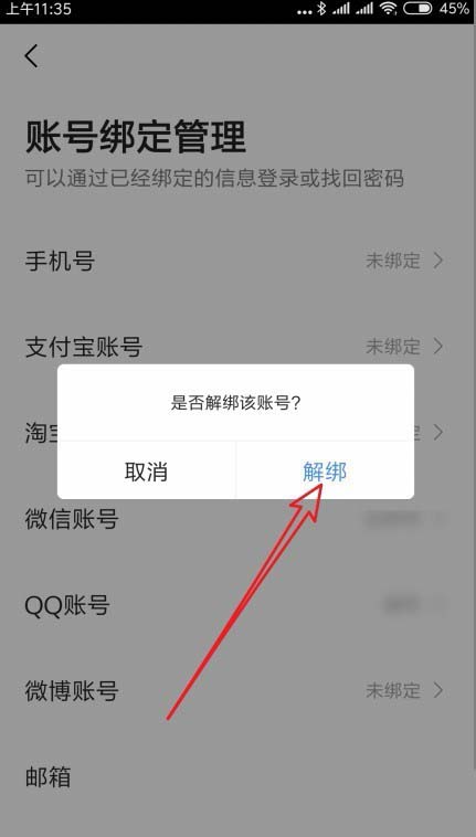 8、这时会弹出一个“确认要解绑账号”的提示,点击“解绑”按钮即可。