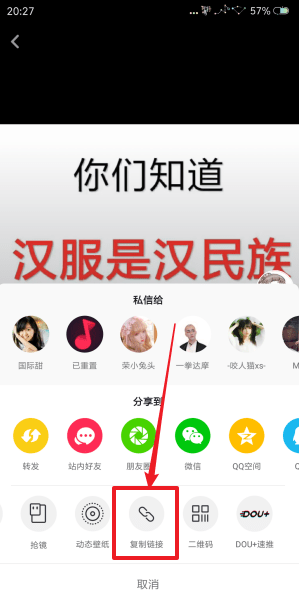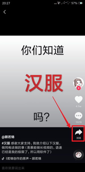 1、打开【抖音App】,找到你喜欢的视频后,点击视频右侧的【分享】图标;