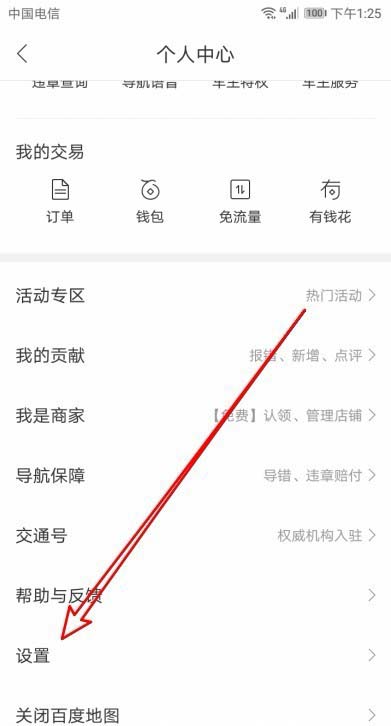3、在打开的百度地图个人中心页面中,点击“设置”菜单项。