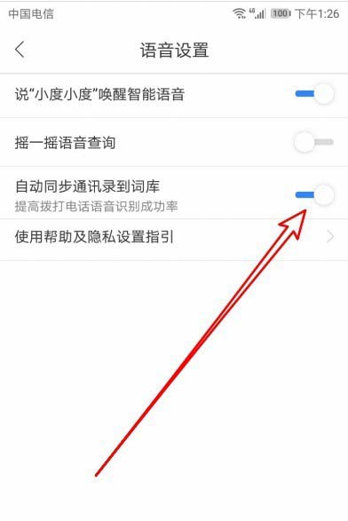 5、在打开的语音设置页面中找到“自动同步通讯录到词库”的设置项。