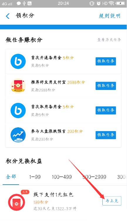 5、看到积分兑换权益的第一项是199积分换一元红包,点击后面的【马上兑】。