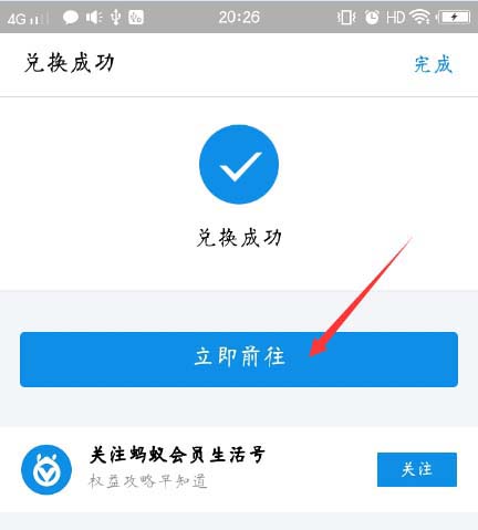 7、兑换成功后,可直接打开点击【立即前往】打开,之后也可以到首页【卡券包】里找到。