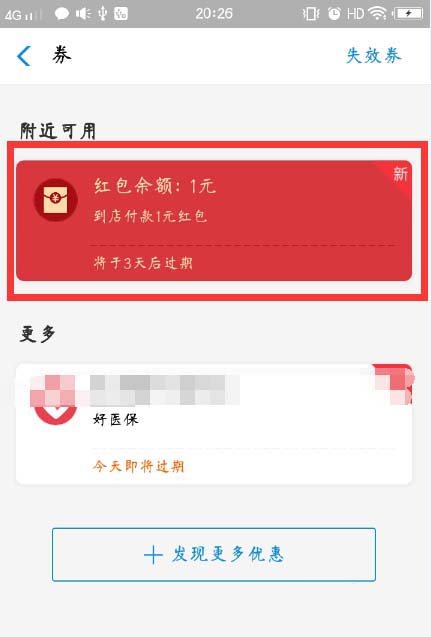 8、这就是兑换来的红包了。红包是有使用期限的,为期三天,过期失效。红包只能是在使用余额宝或花呗线下支付才可以抵扣的,支付金额要大于红包。所以用余额或银行卡之类的是不会抵扣的,支付的时候要看一下支付方式。而像是上交水电费的支付也是没有办法使用红包的,需要线下支付才可以使用。