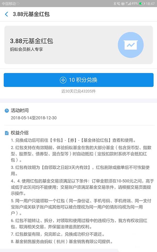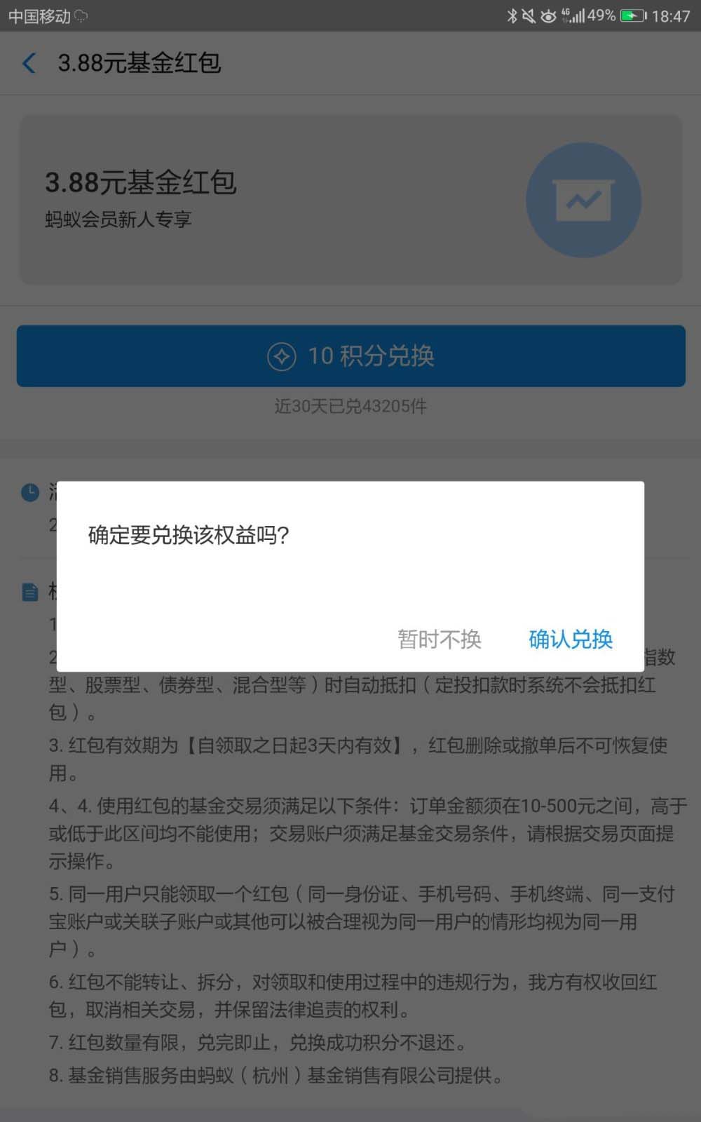 以上就是支付宝积分兑换3.88基金红包的教程,希望大家喜欢,请继续关注脚本之家。