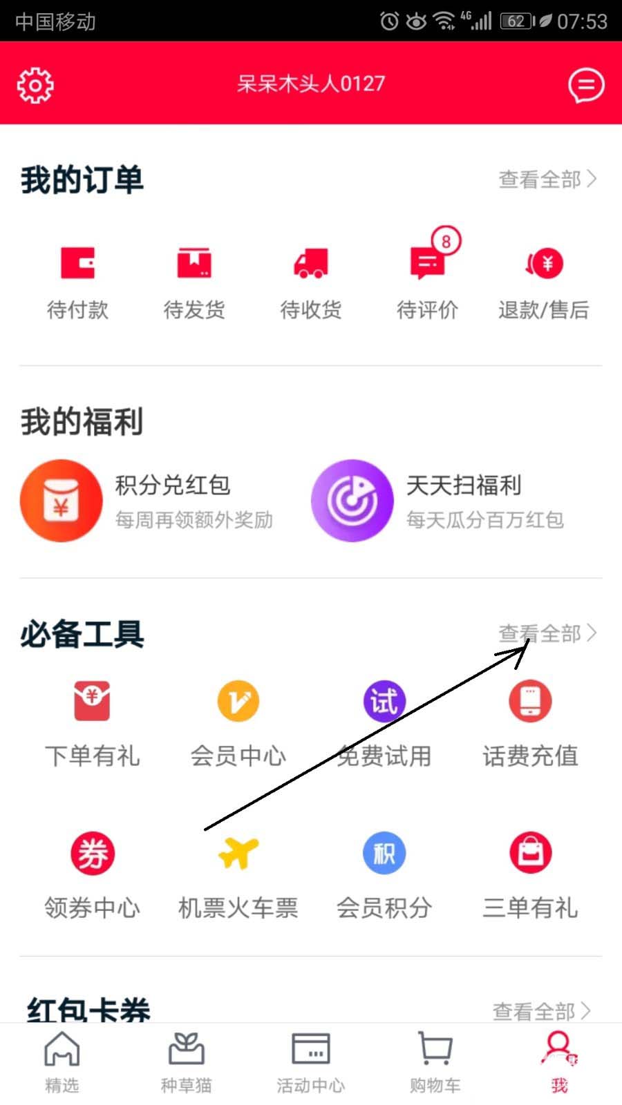 2、在我的栏界面中的必备工具选项下点击查看全部。
