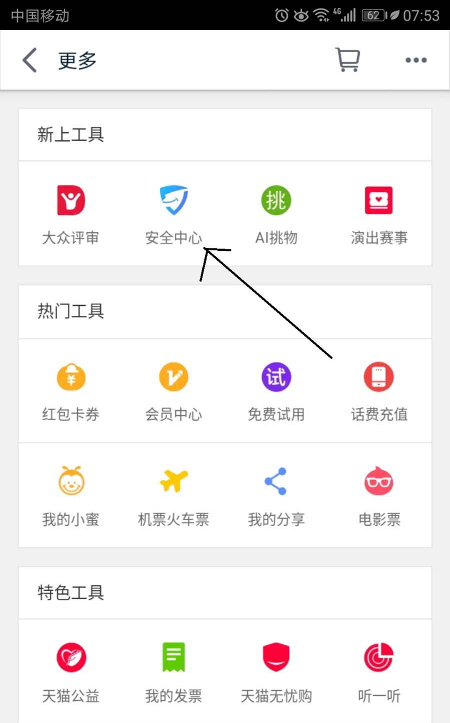 3、打开更多界面中找到安全中心并点击。