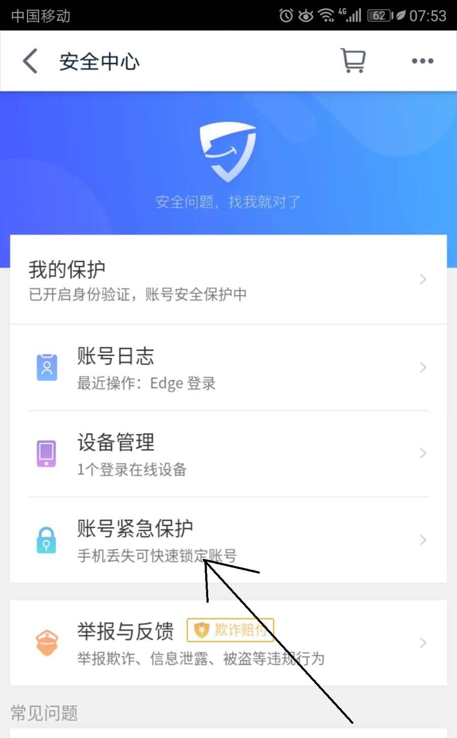 4、切换到安全中心界面中点击帐号紧急保护选项。