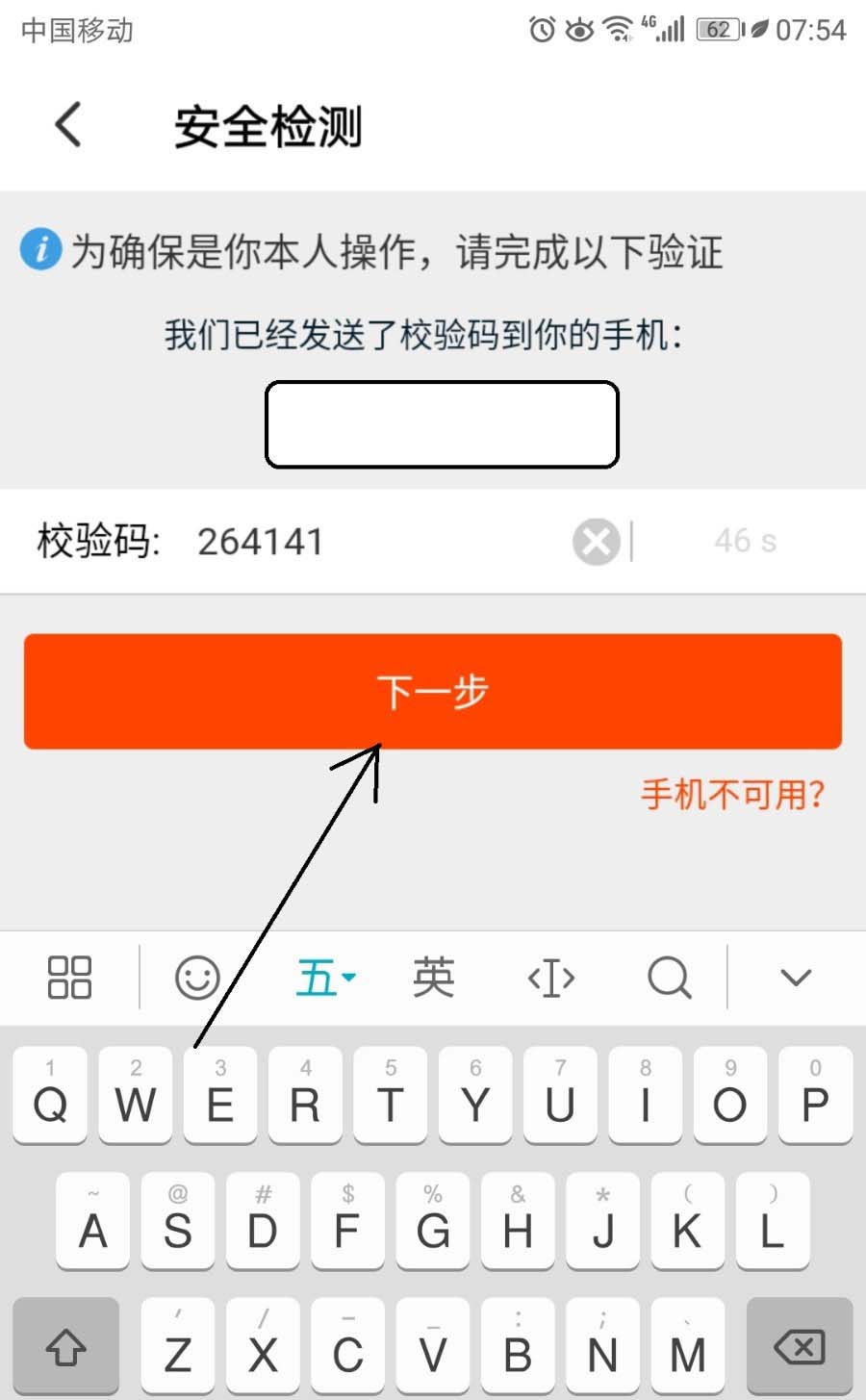 6、切换安全检测界面,此时需要运营商的号码所发的的验证码进行验证即可点击下一步按钮可锁定。