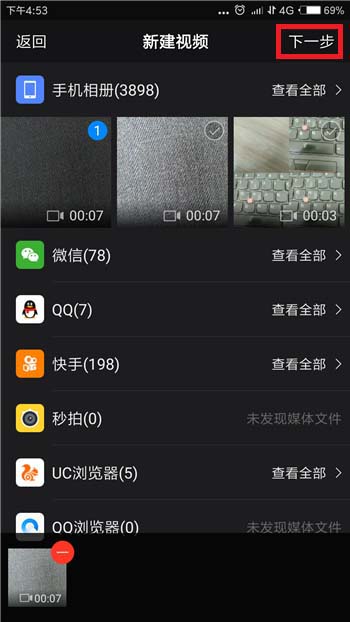 3、点击后会打开手机中的所有视频,包括手机相册和微信等视频,选择好要设置封面的视频后点击【下一步】。
