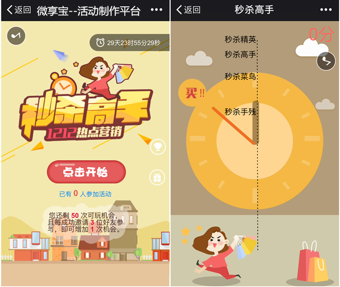 微秒杀:分享给好友以提前秒杀时间。分享的好友越多,抢到宝贝的概率就越大——专为电商营销打造的传播型应用。为了不想输在起跑线上,粉丝不得不大力转发、分享。