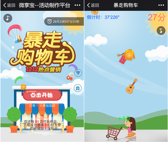 首先制作一个和时事热点或节日热点相关的游戏,这些与热点相关的游戏,在微信朋友圈上的关注度都是相当高的。这里大家也不用担心说自己不会制作这些小游戏,借助微享宝平台,用户只要将公众号授权绑定好即可完成制作,下面三款游戏专为双12营销大战而开发,适用行业广泛,吸粉、互动、传播、引流、转化.