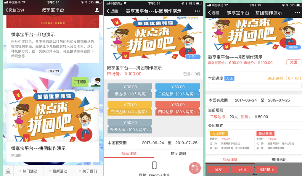 双十二拼团活动:可以让粉丝在我们的公众号里边自由开团,并且分享给自己的小伙伴完成微信拼团,我们商家可以设置邀请的小伙伴越多享受的折扣力度就越大,而且微信拼团不仅仅针对有实物实体店的商家,很多做电商或者课程服务的商家也是可以使用微信拼团的