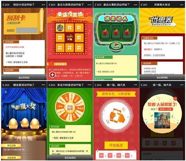 抽奖活动:比如摇一摇抽奖,砸金蛋、九宫格、水果机、大转盘、刮刮卡、优惠券。商家可在后台设置好奖品等活动信息与细节设置,比如抽奖次数、中奖次数等,应用具有超强的传播属性,是“双十二”营销必不可缺的帮手。