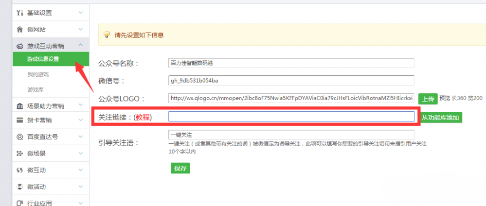 2.然后到快捷关注配置,需要完善里边空的位置,页面上有红字教程,建议可以参考下如何填写的;游戏互动营销-游戏信息设置,填写的和快捷关注配置一样即可。