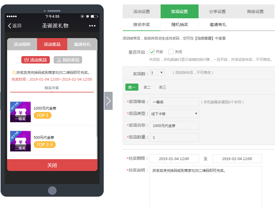 4.编辑好奖项的名称、类型、数量、兑奖期限、兑奖说明即可,就是游戏过程中,如果达到设置的分数门槛,就会弹出抽奖页面,如果中奖会弹出中奖提示;邀请有礼,添加分享奖励类型、增加机会条件、兑奖期限、兑奖说明即可,就是发给小伙伴进行帮忙增加次数的。