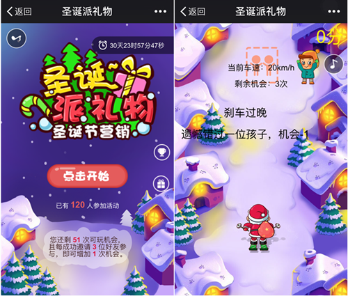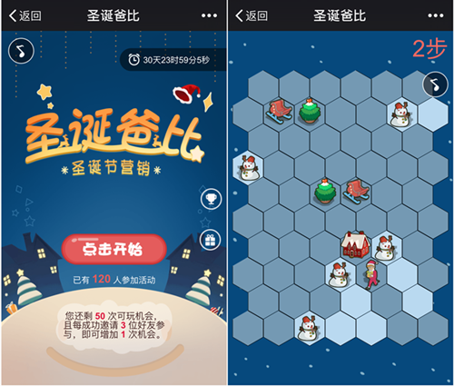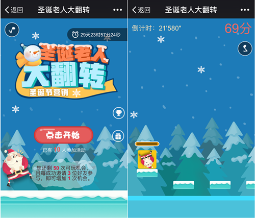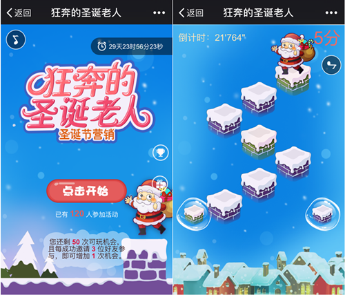 圣诞节和元旦将至,2018年的最后一个节日和2018年第一个节日,都充满浓浓的欢乐气氛圣诞节即将到来,相信到时会有一大波圣诞节微信活动不断涌现出来,其中一定就包括商家自己的活动。为了能在节日营销这个竞争洪流中崭露头角,建议商家采用微信游戏这一种比较新鲜有趣的活动形式来引起用户的注意,圣诞节微信公众号活动里加上一款热门的微信游戏,应该会更搭,下面为大家介绍下圣诞节微信活动怎么做