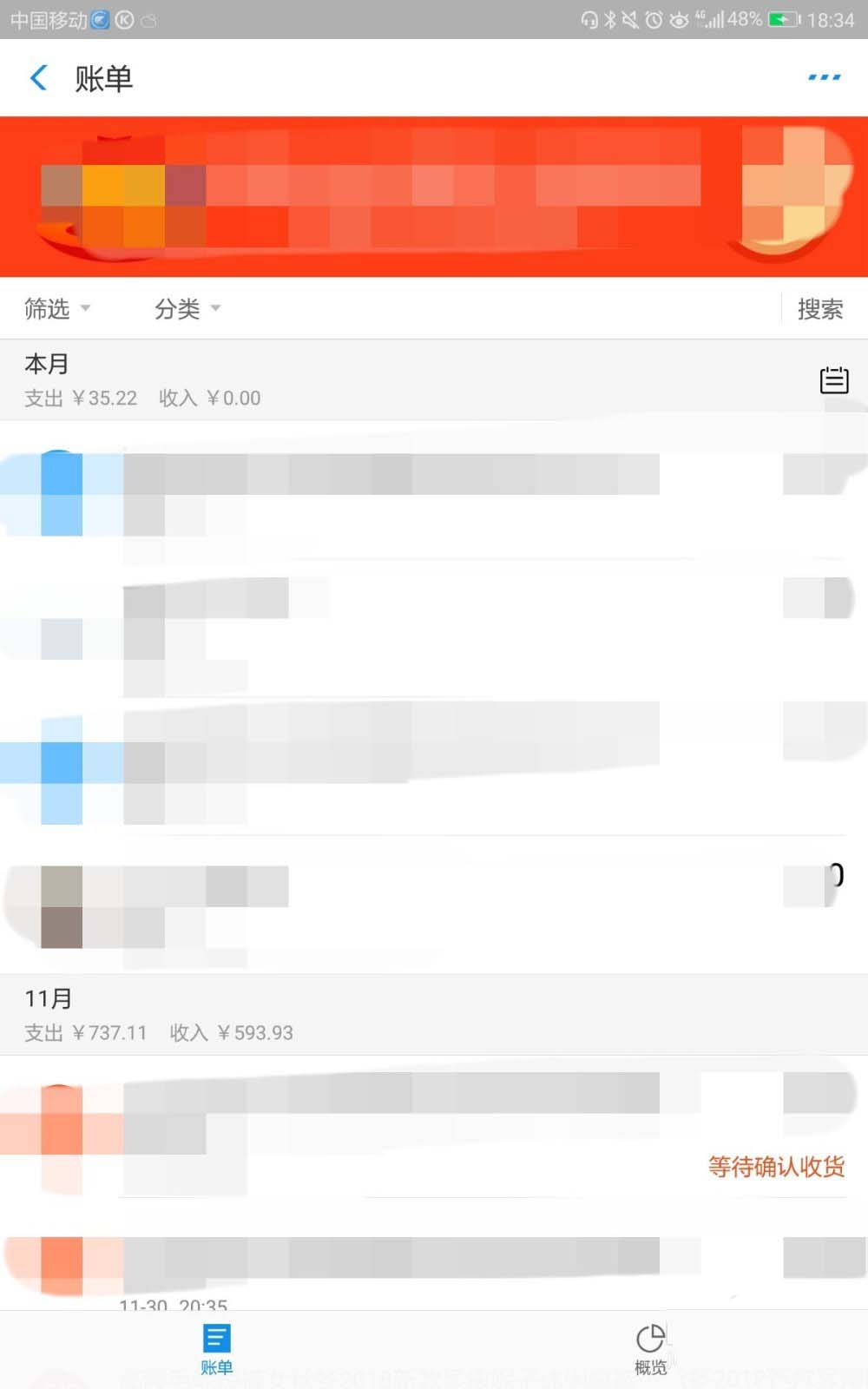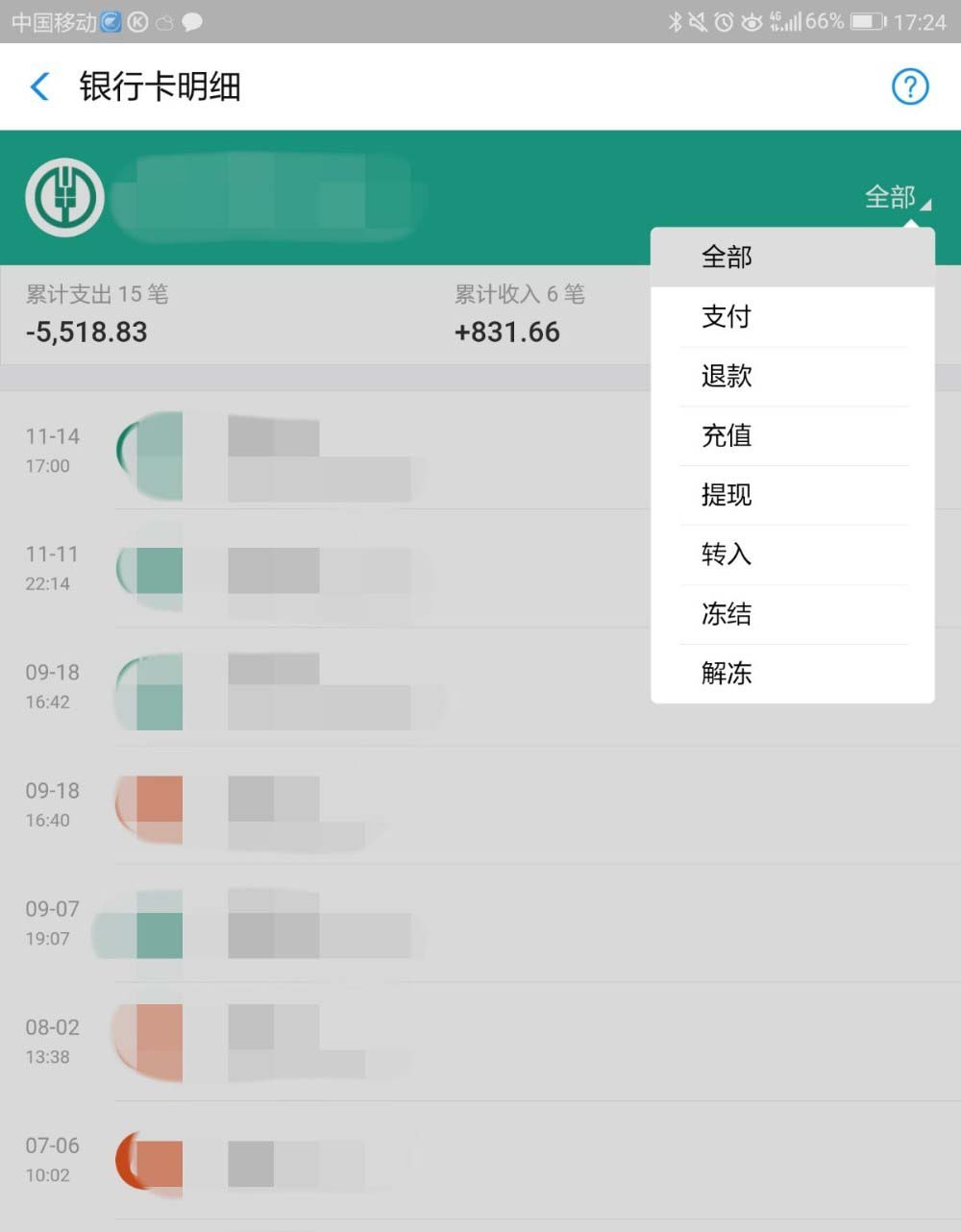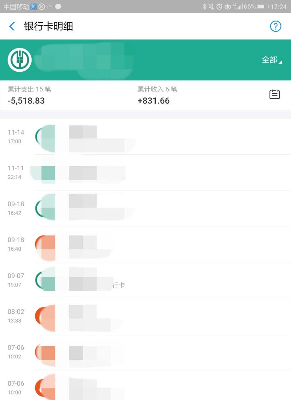 9、最后,还可以点击银行卡后的“全部”,进行单项详情的查看。也可以点击“全部”下的图标进行指定时间内收支情况的查看。