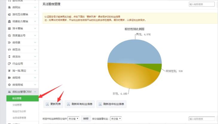 第二步:在左边分类里找到粉丝CRM的粉丝管理,需要先更新粉丝信息,把公众号的粉丝更新到微信第三方的后台,如果公众号粉丝比较多,需要耐心等待一会的。