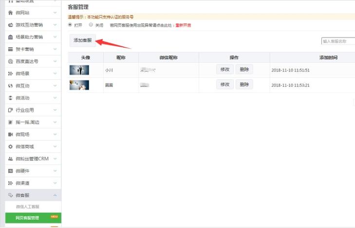 第三步:在微客服中打开网页客服管理并且添加客服,选择客服openid:在粉丝中选择客服;客服头像:上传客服头像;客服昵称:输入客服昵称,如同qq名称一样;描述:对客服进行简单描述,可以针对性格,特长等等。注:客服在粉丝里选择的原因,一个企业的员工肯定是该企业的粉丝;以此类推添加多个自己公司的客服;