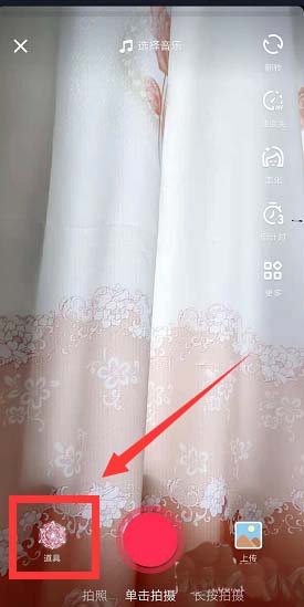 2、进入视频拍摄界面,点击左下角【道具】按钮。